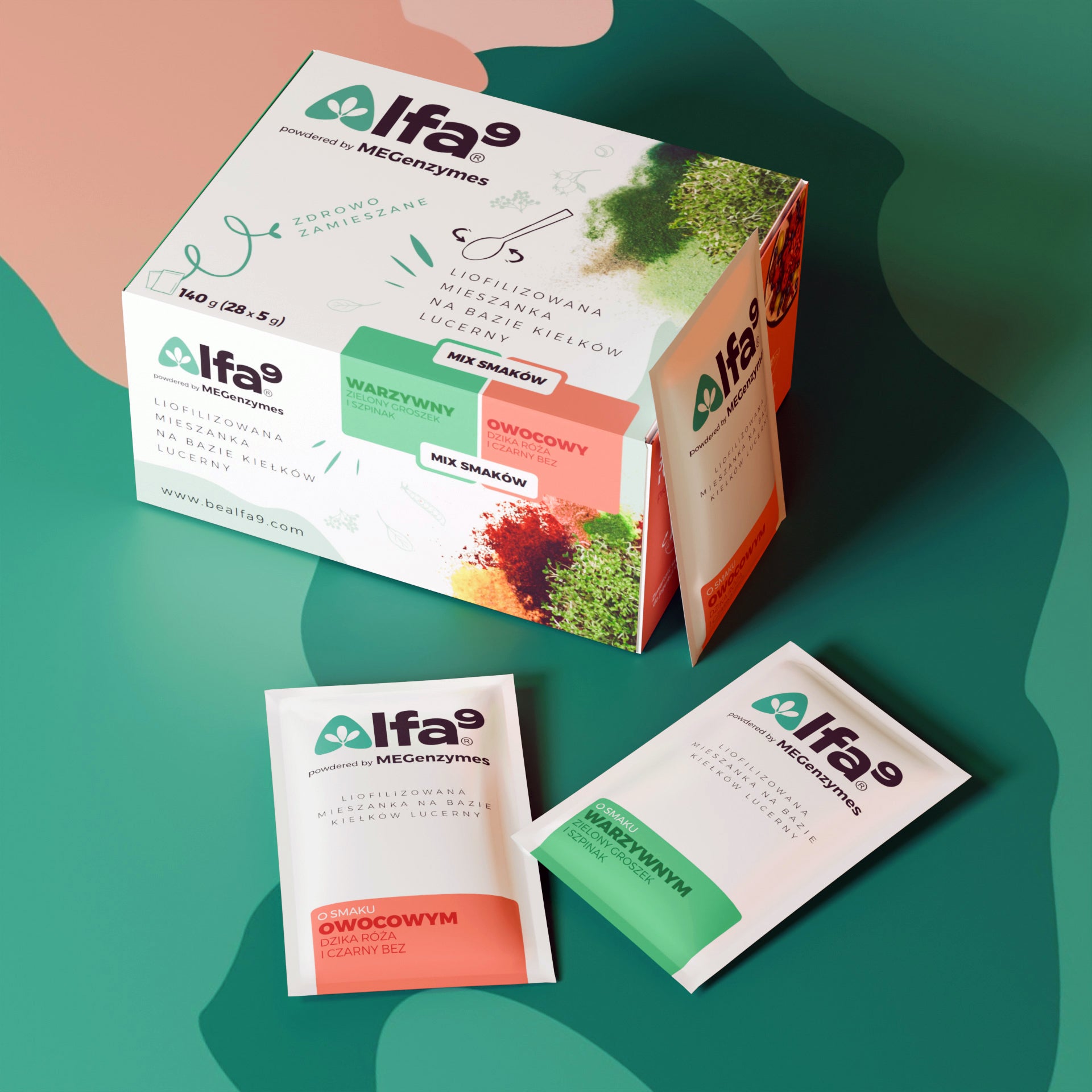 Alfa9 is available in the form of a powdered, freeze-dried mixture with fruit flavor with wild rose and elderberry and vegetable flavor with green peas and spinach. The contents of the selected vegetable sachet should be mixed with e.g. yogurt, kefir, vegetable cocktail, cottage cheese, dip or vinaigrette sauce. In turn, the fruit mixture tastes best with yogurt, including vegan yogurt, kefir, cottage cheese, and dessert.